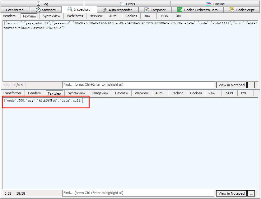 选中请求后点击请求栏的TextView,点击请求信息栏,可对数据进行更改。如下图所示将验证码改成错误的值,