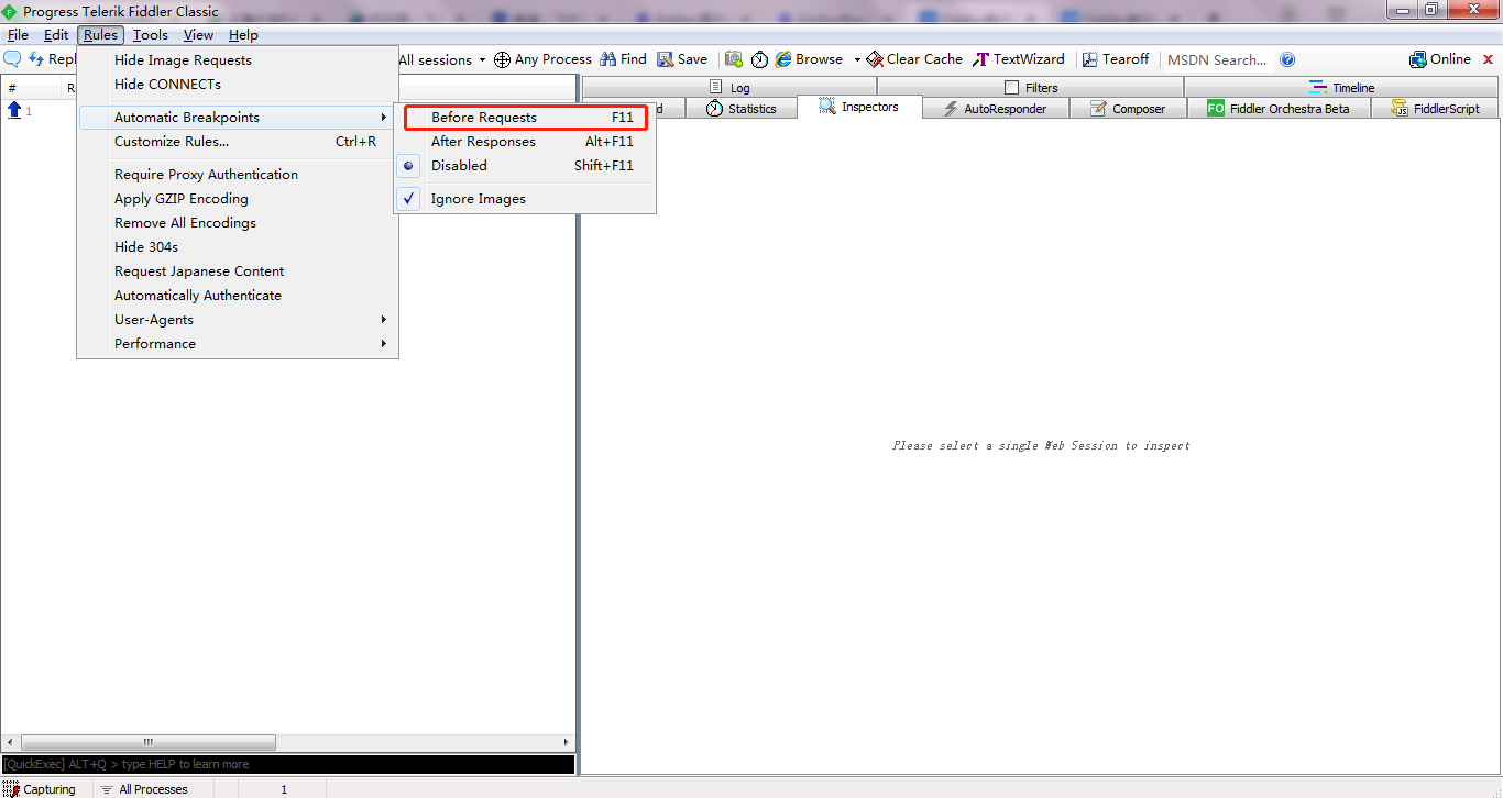 在顶部菜单栏,依次点击Rules——Automatic Breakpoints——Before Requests,