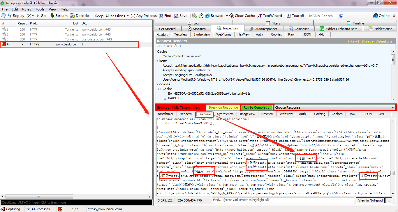 打开Fiddler后开启响应断点,再访问百度地址。选中请求后点击响应栏的TextView,点击响应信息栏,可对返回的数据进行更改。如下图所示,在百度部分导航栏的名称后面加上test,然后点击Run to completion按钮,