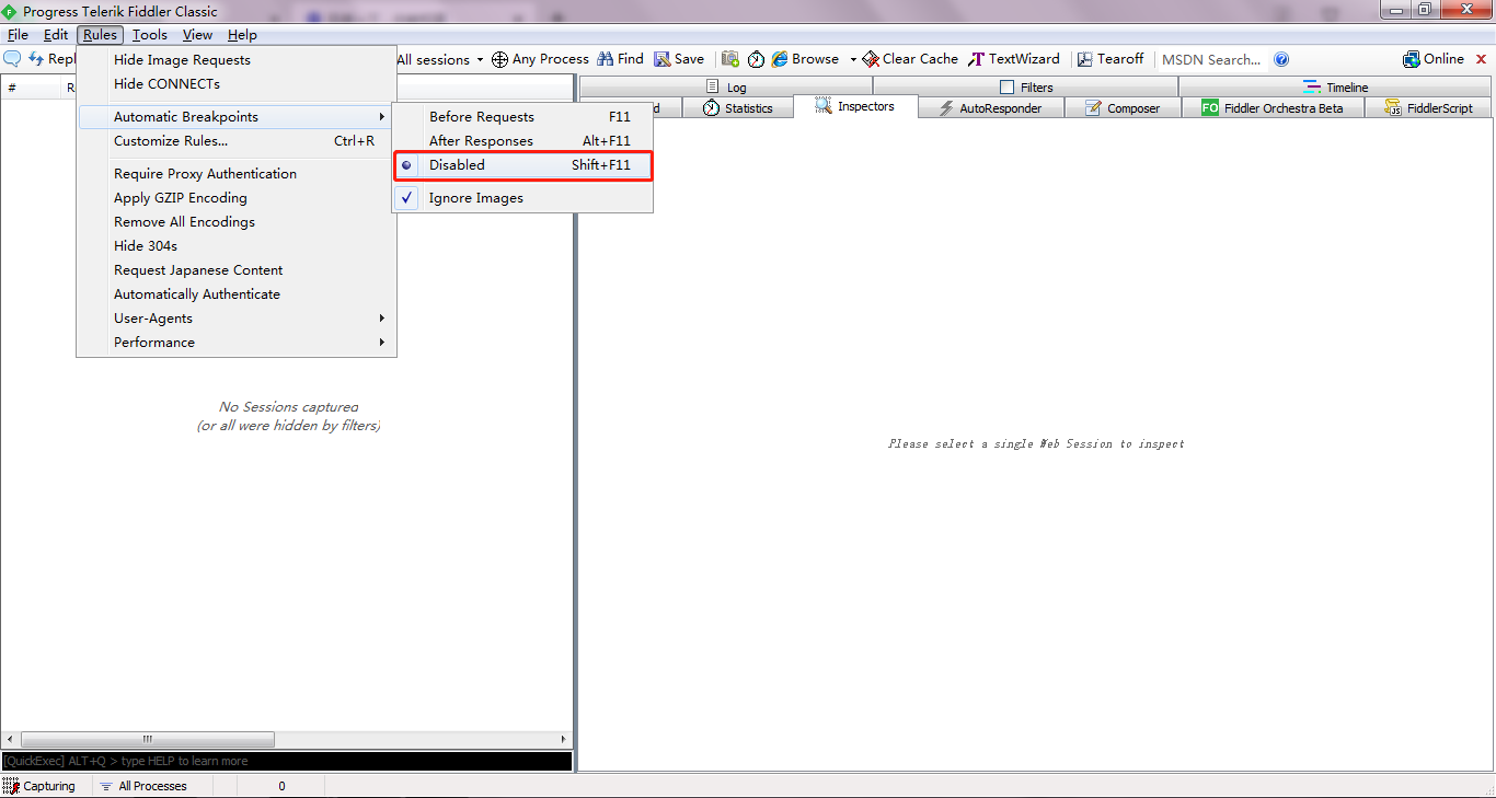 可通过依次点击Rules——Automatic Breakpoints——Disabled或按Shift+F11来关闭请求断点。
