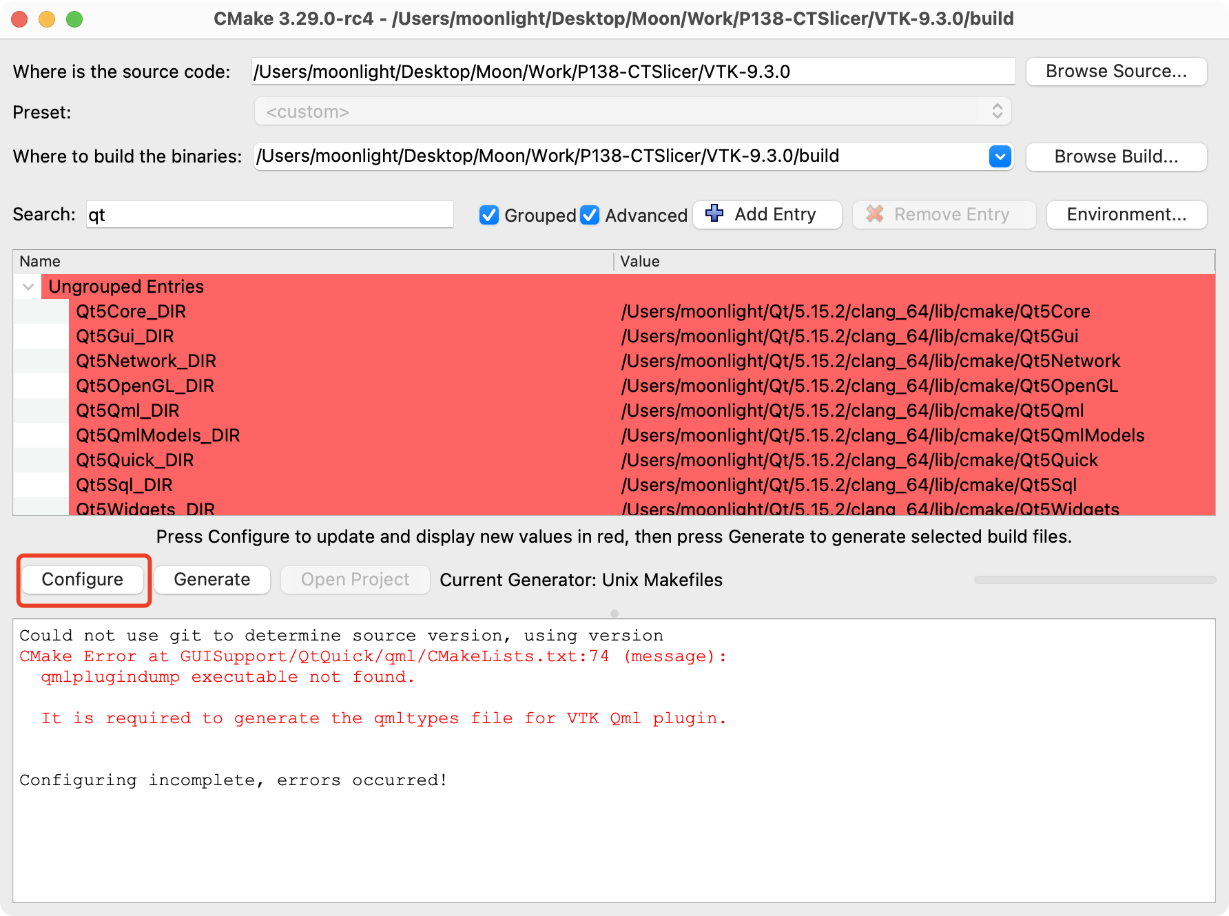3)完成后列表中会出现很多模块,需要让VTK支持Qt,在搜索框中输入qt,将过滤出来的模块全部改为WANT,再次点击Configure。